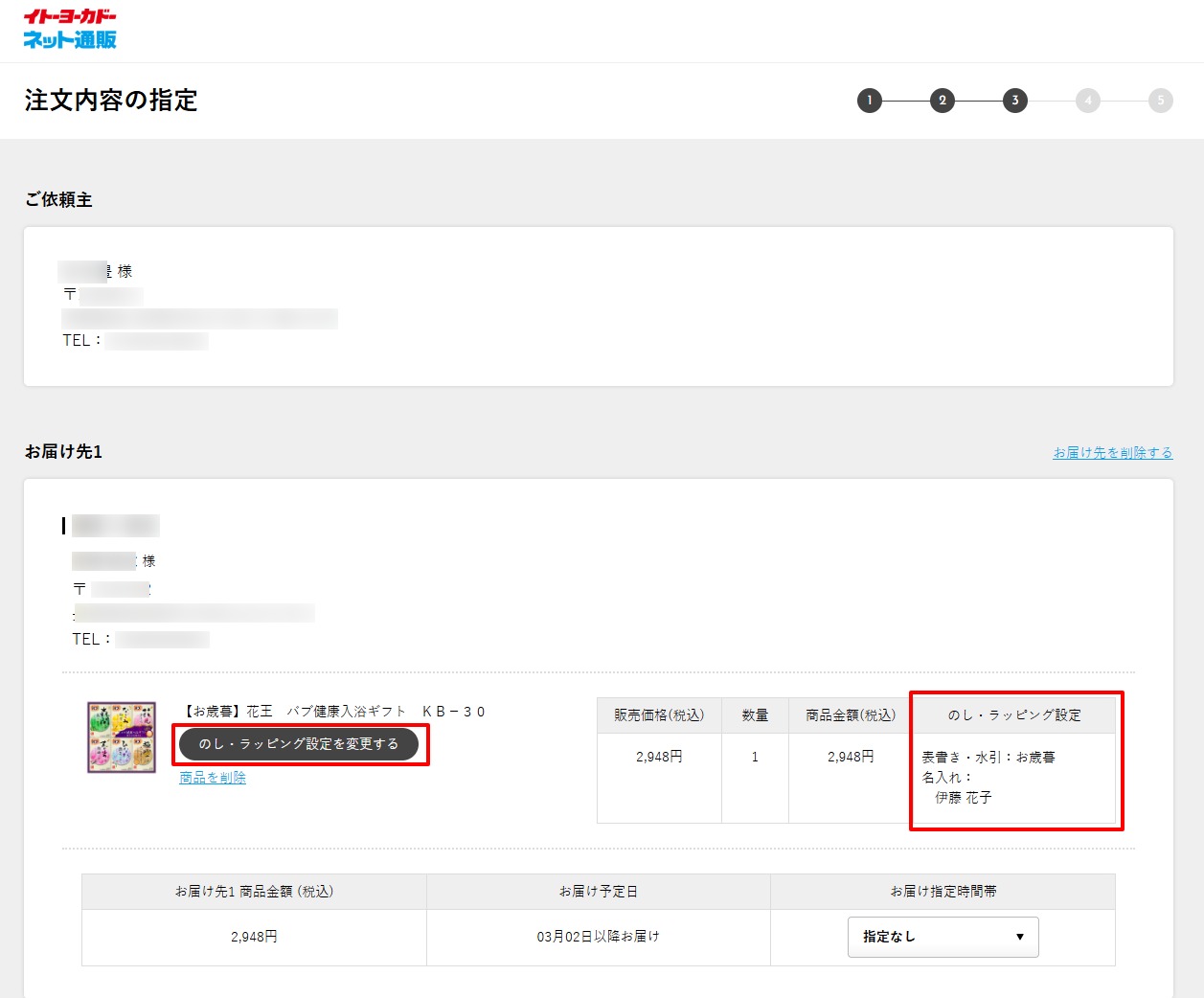 変更がある場合は「のし・ラッピング設定を変更する」ボタンを押し、修正してください。