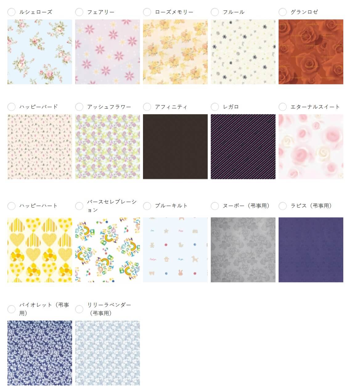 包装紙は下記のものからお選びいただけます(ギフト袋はありません)。