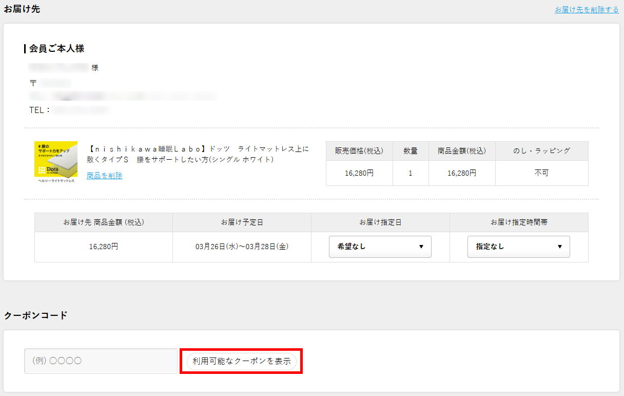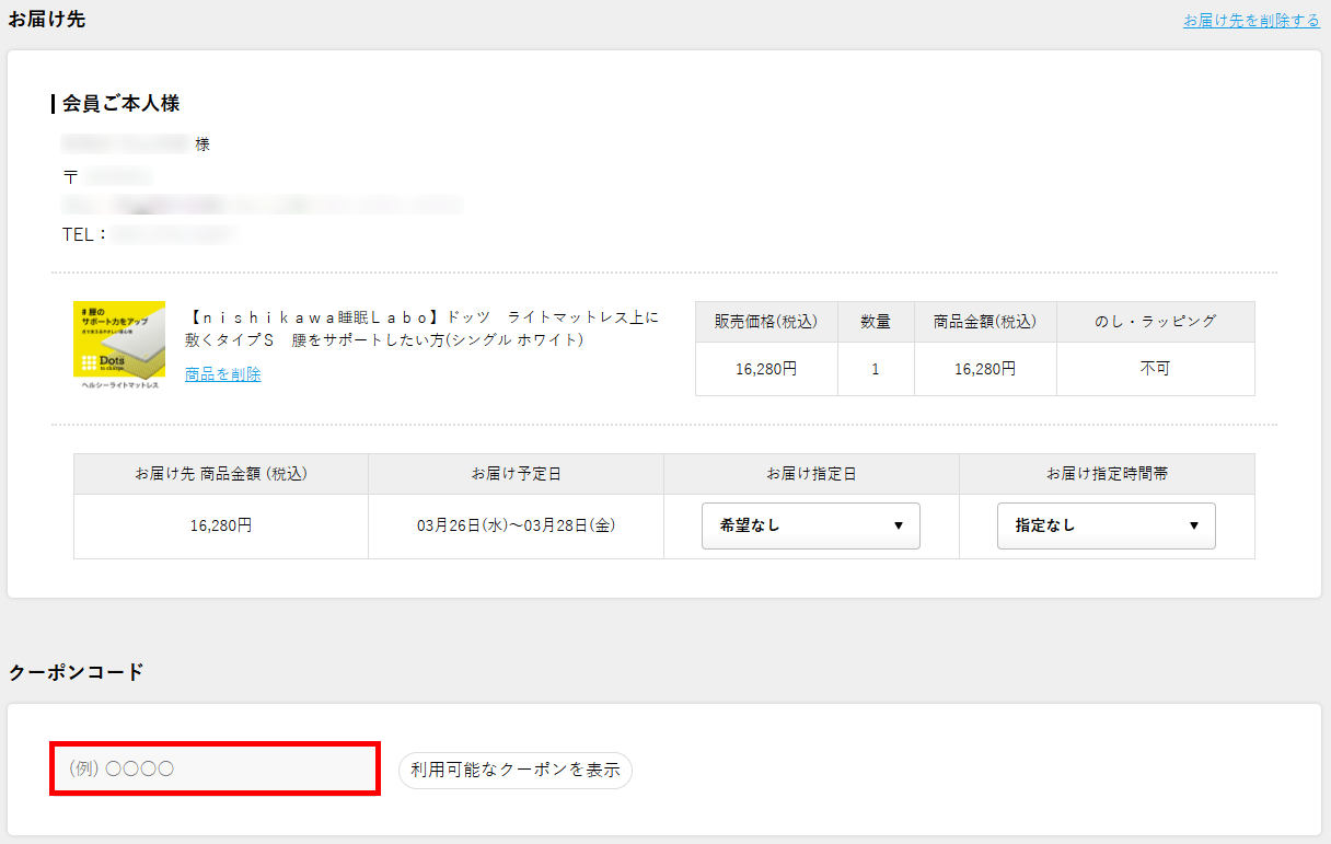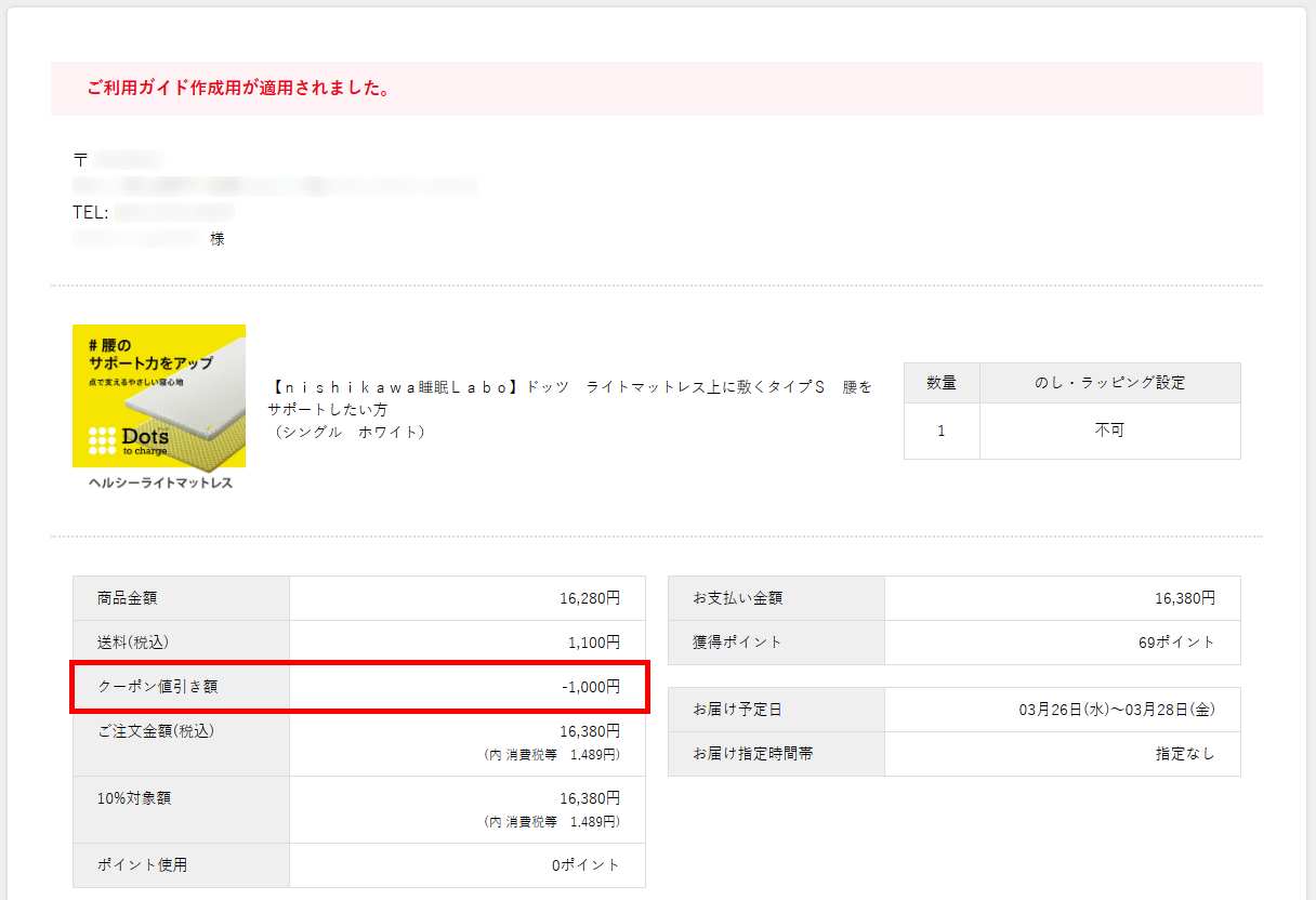 「注文内容の確認」画面でクーポン値引きが適用されていることを確認します。お支払金額にクーポン値引き額が反映されていることをご確認ください。