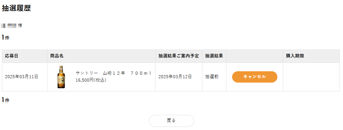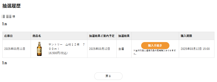 抽選履歴に記載された購入期限までに注文を完了してください。