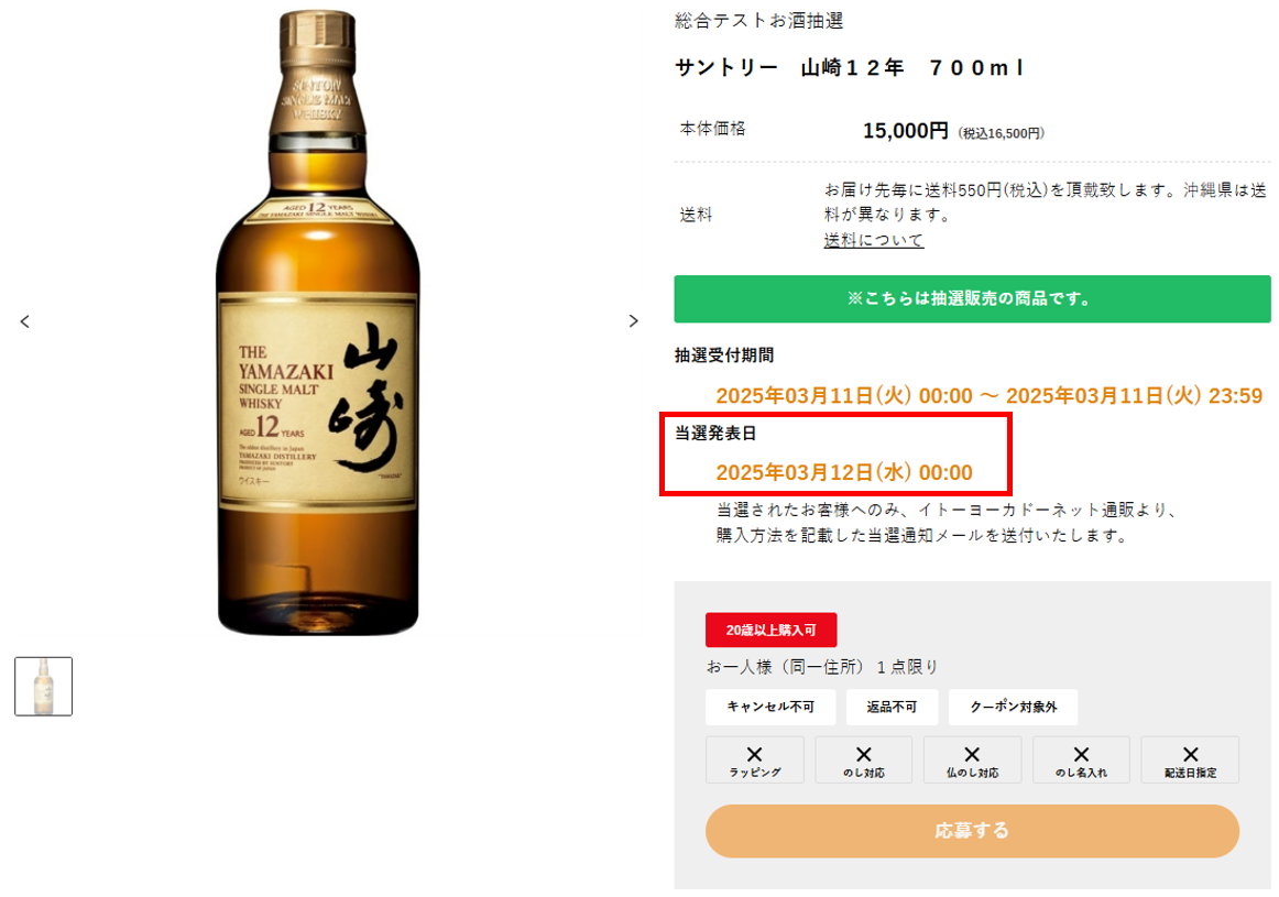 当選発表日時は抽選専用ページに記載しています。