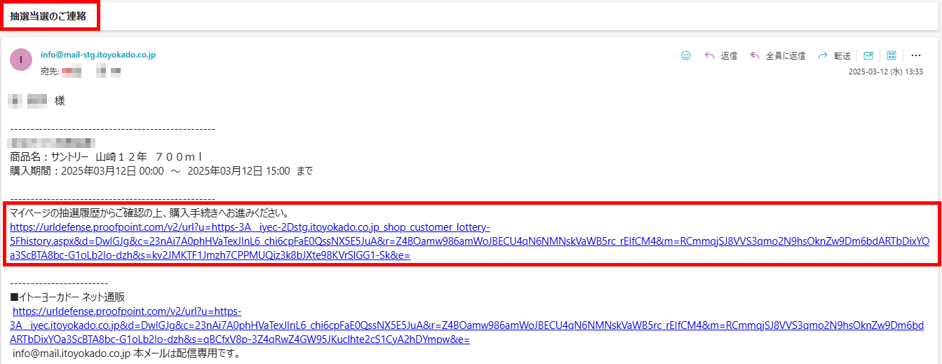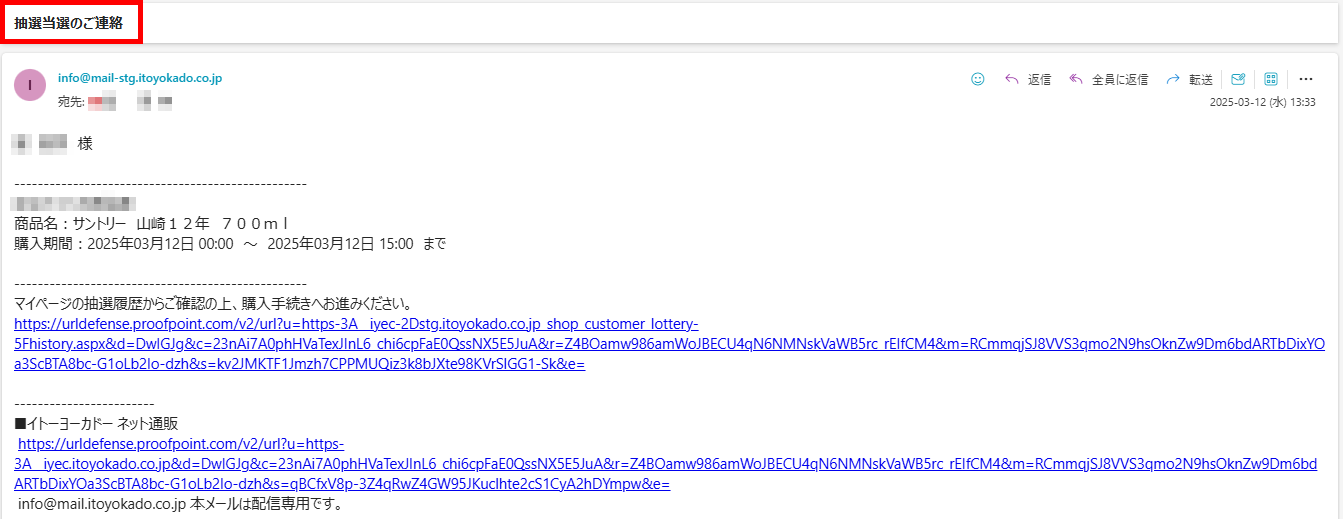 当選者には記載された当選発表日時よりメールにて「抽選当選のご連絡」メールが配信されます。