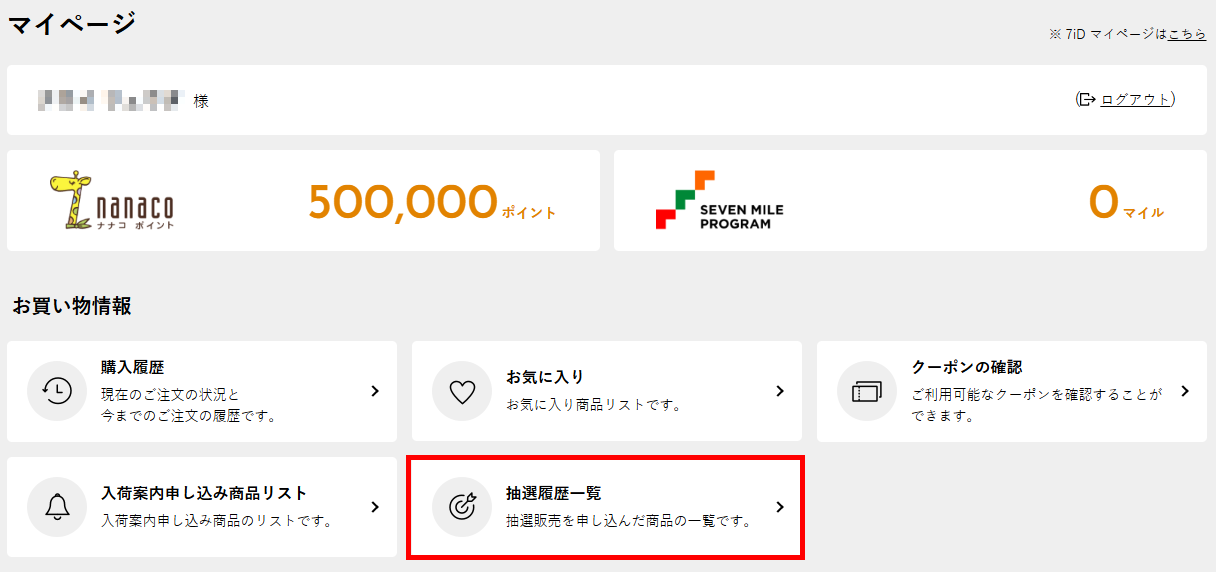 「抽選当選のご連絡」メールに記載の「マイページの抽選履歴」URLをクリックするか、またはマイページの「抽選履歴一覧」を押下すると抽選申込履歴が確認できます。