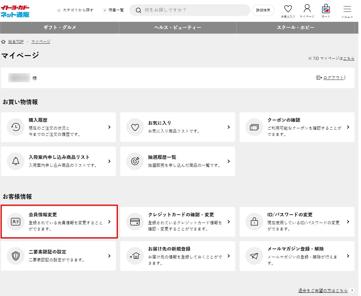 マイページメニューが表示されますのでお客様情報の「会員情報変更」を押します。