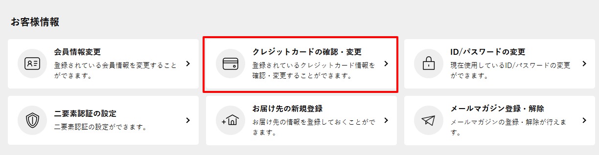 マイページメニューが表示されますのでお客様情報の「クレジットカードの確認・変更」を押します。