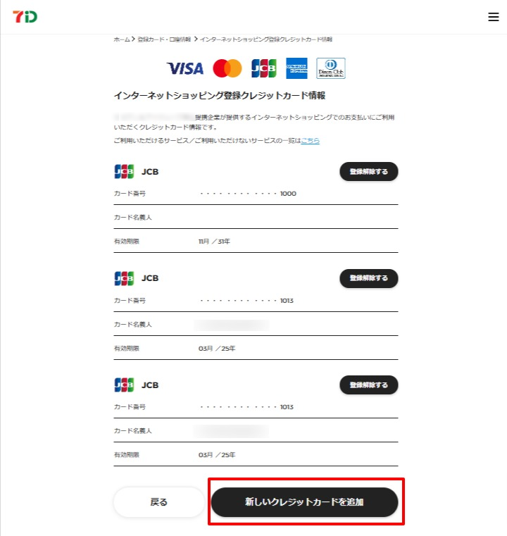 現在の登録内容が表示されますので、下部の「新しいカードを追加する」ボタンを押してください。