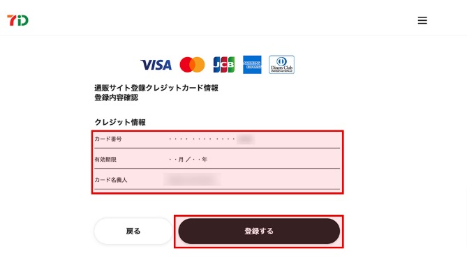 通販サイト登録クレジット情報登録内容確認面にて 「カード番号の末尾4桁(末尾4桁以外は伏せ字)」「有効期限」「カード名義人」を確認のうえ「登録する」ボタンを押下し、登録完了画面へ遷移し登録完了です。