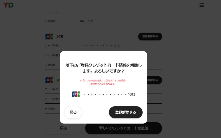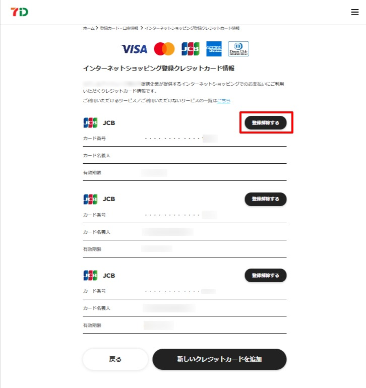インターネットショッピング登録クレジットカード情報内容確認面にて解除するクレジットカードの種類、カード番号、カード名義人、有効期限を確認のうえ、「登録解除する」ボタンを押下します。