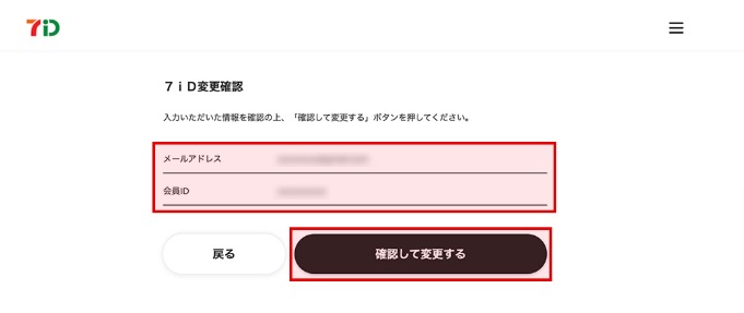 7iD変更確認画面で入力いただいた情報をご確認のうえ、「確認して変更する」ボタンを押してください。