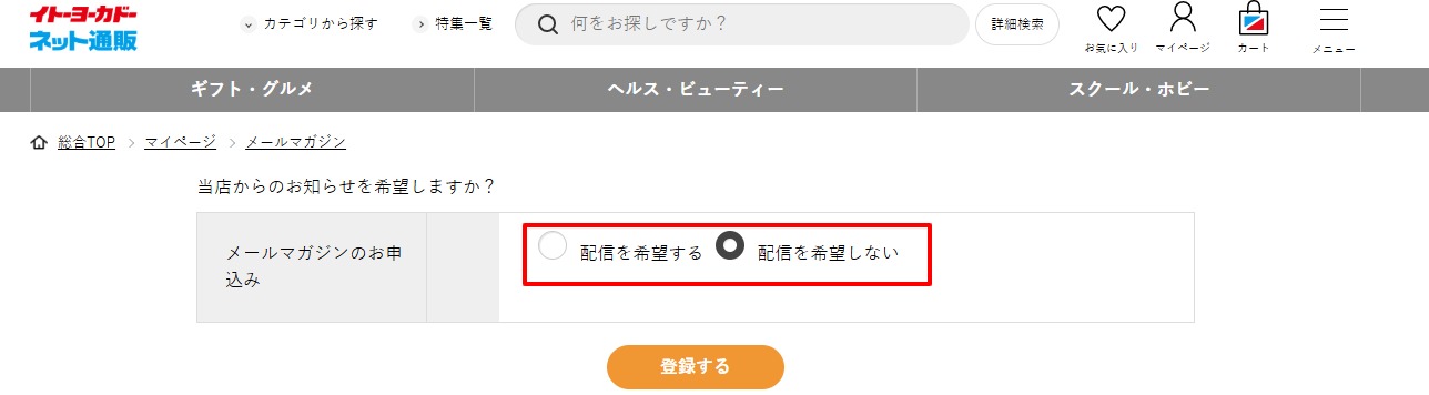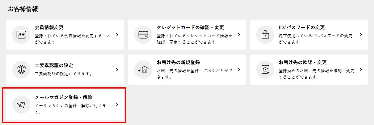 ログイン後、マイページのお客様情報の「メールマガジン登録解除」を押します。