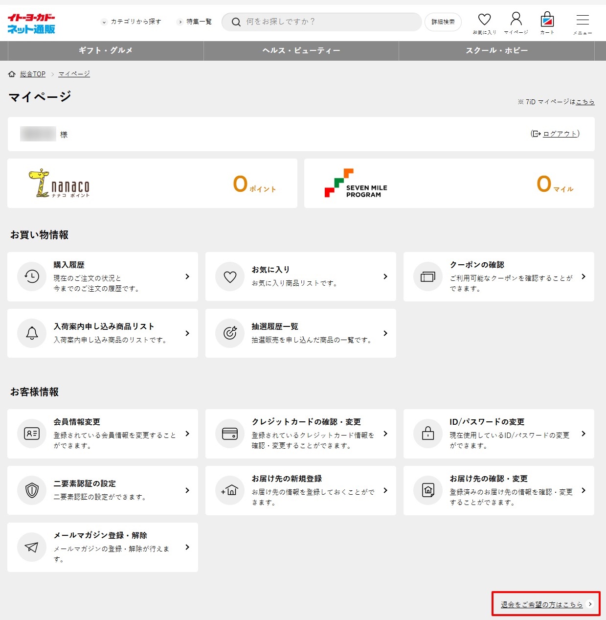 - 7iD会員の退会になりますので、イトーヨーカドーネット通販だけの退会はできません。