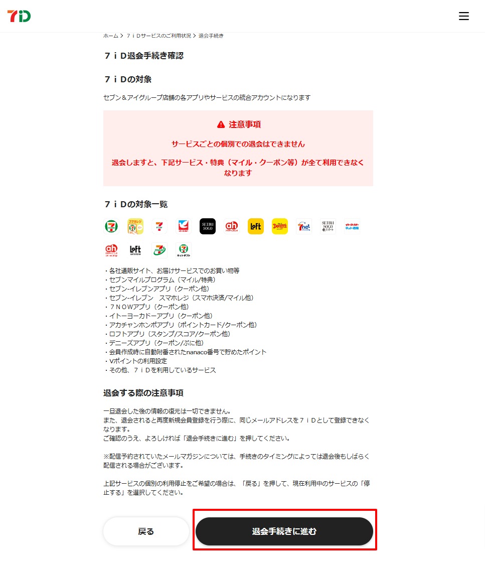 「7iD退会手続き確認」画面にて注意事項をご確認いただき、「退会手続きに進む」を押します。