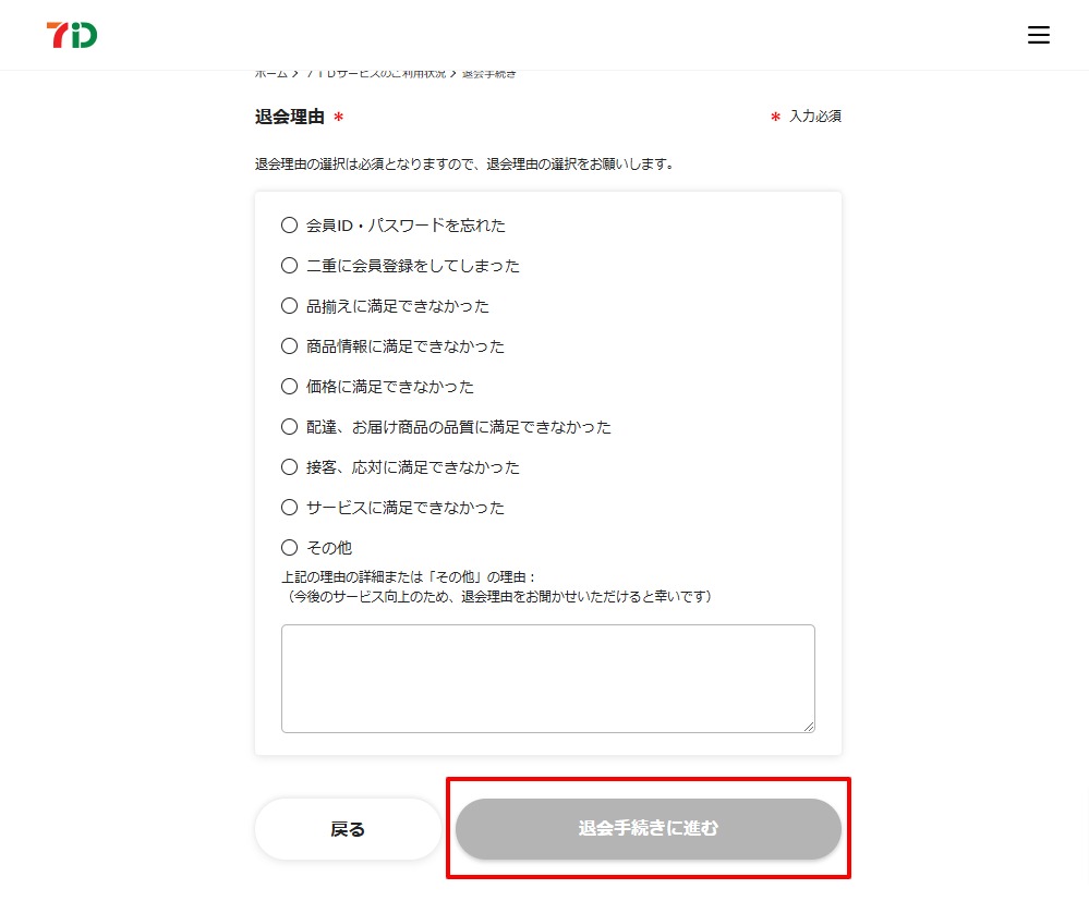 4.「7iD(メールアドレス)」と「退会理由」を確認し「了承のうえ、退会する」を選択