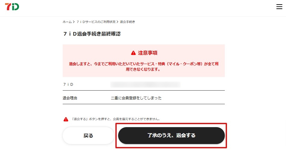 - 退会後はご登録いただいていた会員情報での7iDアカウントサービスのサービス利用が停止されます。